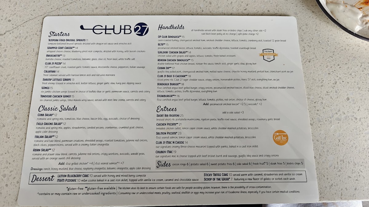 Patrons rave about the exceptional service and delightful dishes like lobster bisque andarancini. With a beautiful view of the golf course, Club 27 offers not just a meal, but a delightful experience. Join us for a visit, and discover the flavors that have everyone talking!